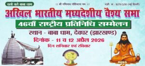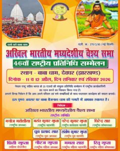 देवघर, झारखंड: अखिल भारतीय मध्य देसीय वैश्य सभा का 46वां राष्ट्रीय प्रतिनिधि सम्मेलन 11 और 12 अप्रैल 2026 को देवघर में आयोजित किया जाएगा। यह आयोजन शांति कोठी, बैजनाथ धाम परिसर में होगा, जहां देशभर से समाज के प्रतिनिधि बड़ी संख्या में भाग लेंगे।